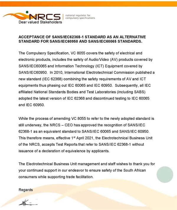 2021年4月1日,南非NRCS首席執(zhí)行官已批準(zhǔn)將SANS / IEC 62368-1認(rèn)可為SANS / IEC 60065和SANS / IEC 60950的等效標(biāo)準(zhǔn)。