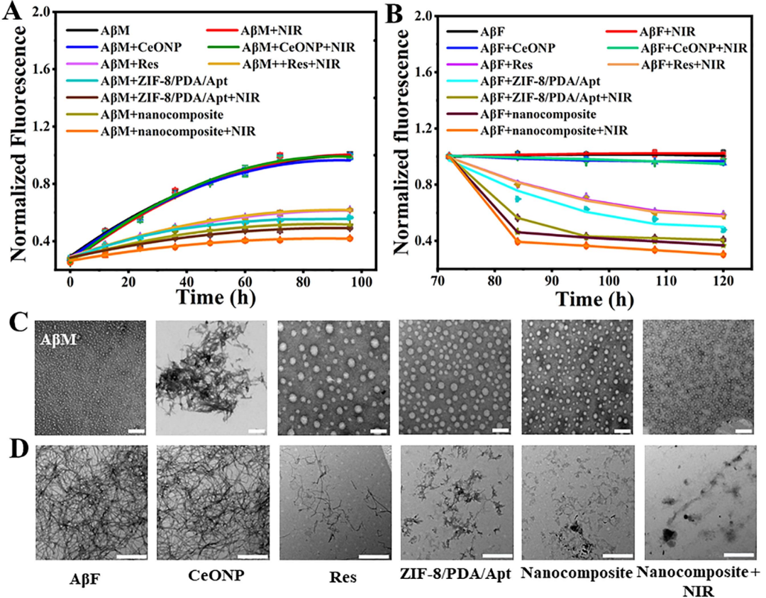 本文所構建的“核-殼”CeONP-Res-PCM@ZIF-8/PDA/Apt納米材料,能夠通過熒光共振能量轉移,實現對AβO的熒光檢測,且特異性強、靈敏度高,能夠在細胞水平檢測AβO并監測AβO病理進展。另一方面,該探針具有良好的光熱轉換性能,并具有高載藥率,能夠實現NIR可控的Res釋放。體外與細胞水平實驗表明,該探針在ROS清除、抑制Aβ單體聚集、解聚Aβ纖維方面顯示出了優異的治療效果,并且能夠有效地保護神經細胞免于Aβ誘導產生的凋亡,并在NIR刺激下,材料的光熱性能能夠進一步增強治療效果。