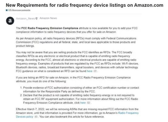 近日,亞馬遜又出新政策了,有關(guān)Amazon.com美國(guó)站銷(xiāo)售的射頻設(shè)備(RFD)必須滿(mǎn)足FCC合規(guī)新要求,強(qiáng)調(diào)了所有射頻設(shè)備(RFD)必須在2022年3月7日前提供FCC合規(guī)證明和信息,否則將會(huì)下架處理!