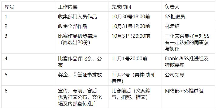 參賽者將作品以郵件附件形式交給本部門5s推進員。由5S推進員收集整理,并于10月31號下午12:00前交給公司5S改善組林孟韜。