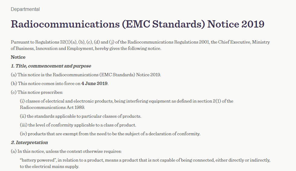 2019年無線電通信(EMC標準)公告于2019年6月4日生效,并更新了新西蘭的EMC標準。本通知描述了電氣和電子產品(無線電標準通知所涵蓋的許可無線電發射機除外)要求的性能標準。它還為產品分配一致性水平,并為使用無線電能量的設備(ISM設備)分配允許的頻段。