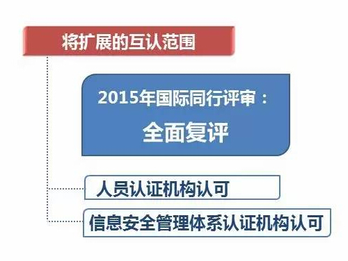 2015年,CNAS接受國(guó)際同行評(píng)審對(duì)我們已經(jīng)加入互認(rèn)的認(rèn)可制度的全面復(fù)評(píng)。同時(shí),我們還新申請(qǐng)擴(kuò)展互認(rèn)范圍,包括信息安全管理體系認(rèn)證機(jī)構(gòu)認(rèn)可和人員認(rèn)證機(jī)構(gòu)認(rèn)可兩項(xiàng)認(rèn)可制度。
