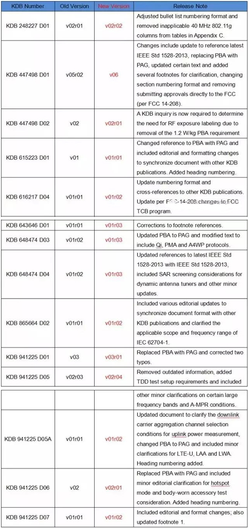 近日,F(xiàn)CC認證中SAR測試標準--KDB標準進行了更新。其中KDB 648474 D03 v01r04 為當前最新版本; KDB 941225 D05 v02r05 為當前最新版本,具體更新請參考下表。