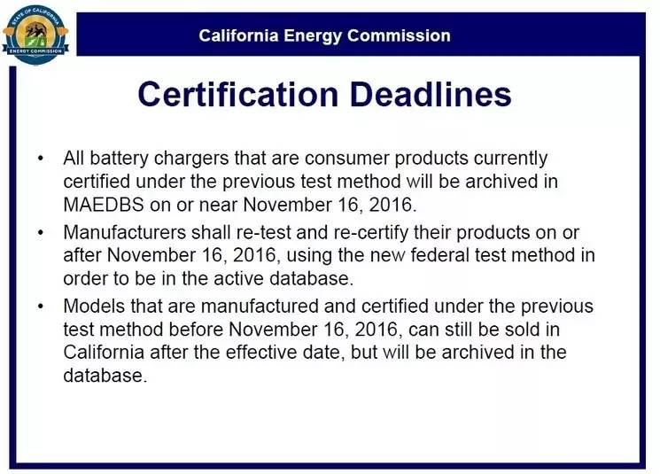 據(jù)CEC官方最新要求,加州能源委員會(huì) (CEC)更新電池充電器測(cè)試方法做了更新,具體如下: