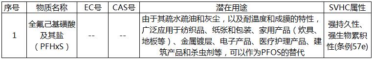 2017年6月16日,歐盟化學品管理局(ECHA)在官網發布消息,確定將全氟己基磺酸及其鹽類(PFHxS)歸類為高關注物質,雙酚A(BPA)因其生殖毒性已于2017年1月12日被加入SVHC清單,因其內分泌干擾特性被再次確認為SVHC物質。