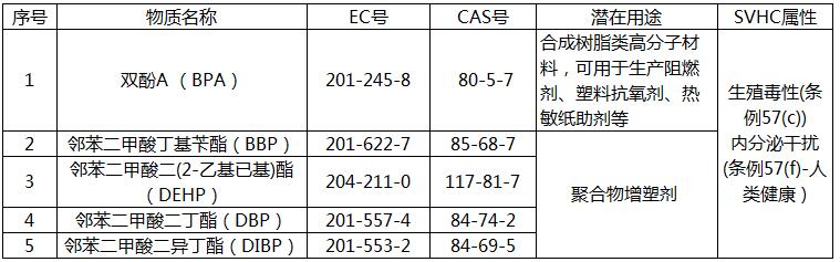 2017年7月7日歐盟化學品管理局(ECHA)正式更新REACH法規SVHC候選清單,并新增現有物質雙酚A(BPA)及4項鄰苯的內分泌干擾屬性。至此,SVHC候選清單共17批174種物質。