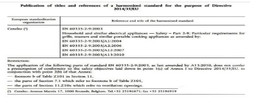 此次的相關決議來自于德國和挪威兩國對EN60335-2-9部分內容的反對意見,他們認為在原標準第11節“加熱”章節中,包括對可接近的非功能性表面的溫度限制的規定不足。而且該標準允許對溫度限制的幾個赦免。如在一些情況下僅僅需要在標簽上含有警告通知,且警告標簽的顏色可能與國際警告顏色不同,可能會混淆用戶。此外,由于原標準要求的含糊之處,原標準可以解釋為可以省略對產品某些部分溫升的測量,這可能導致消費者無視整個產品的適用的溫度限值。因此,對人畜的潛在燃燒風險仍然存在。基于以上原因,原EN60335-2-9標準不應該推定符合“2014/35 / EU”安全指令要求。