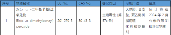 2023 年 10 月 2 日,ECHA再次公布一項(xiàng)新的SVHC 意向物質(zhì),并計(jì)劃于2024 年 2 月對(duì)該物質(zhì)開(kāi)展公眾評(píng)議,該物質(zhì)具體信息如下: